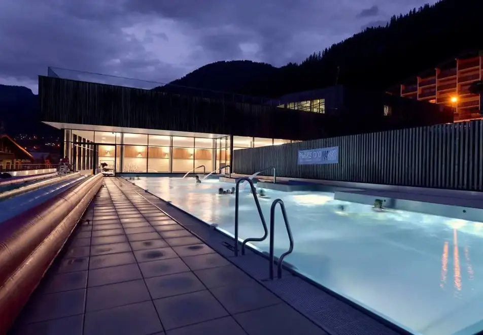 The outdoor pool: 200m2 and 1.25m deep, completes the part of the centre reserved for water leisure activities, with an unobstructed view over the valley. Heated to 32° in winter, it offers the possibility to swim in the open air. In summer there is a terrace with sunbathing, an aquasplash for children and a green area where activities (badminton, volleyball...) are held.