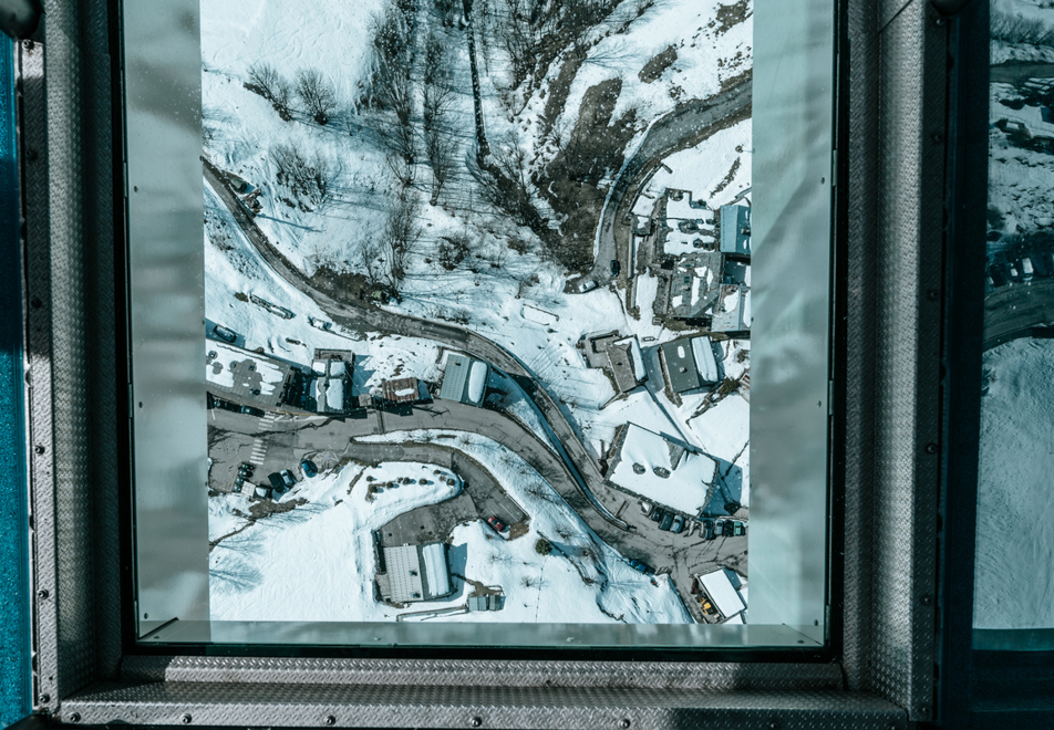 Paradiski presents VertiGO thanks to a 1.70m2 transparent glass plate in the floor (since 2015) of the lower level of both of the 2 cabins, passengers can enjoy the view in 3 dimensions, combining a 360° panorama of the legendary surrounding mountain peaks and a plunging view of the Ponthurin valley under your feet!